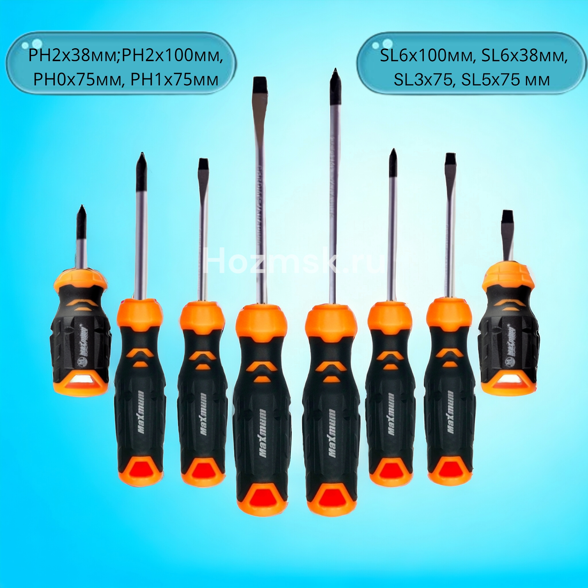 Комплект отверток PH/SL от «Maximum» N 1080 изготовлен из хром-ванадия и содержит 8 отвёрток разного размера со шлицами PH и SL.