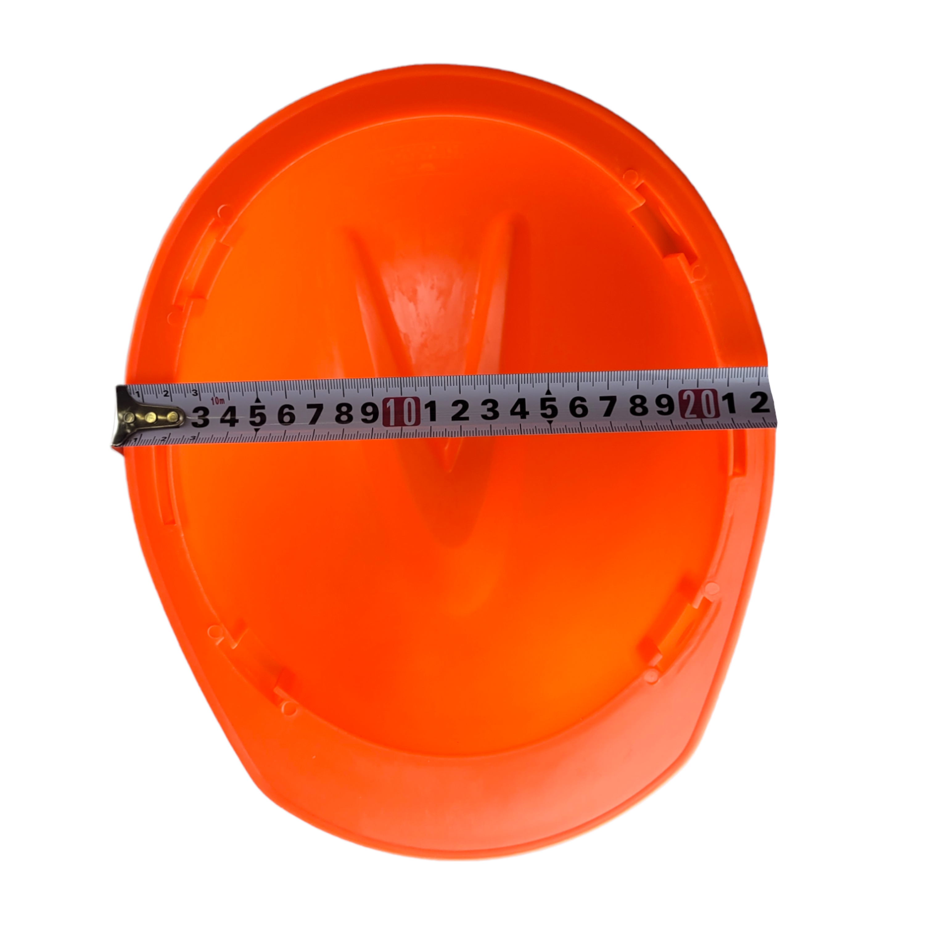 Защитная оранжевая каска легкая и прочная выполнена из полипропилена.